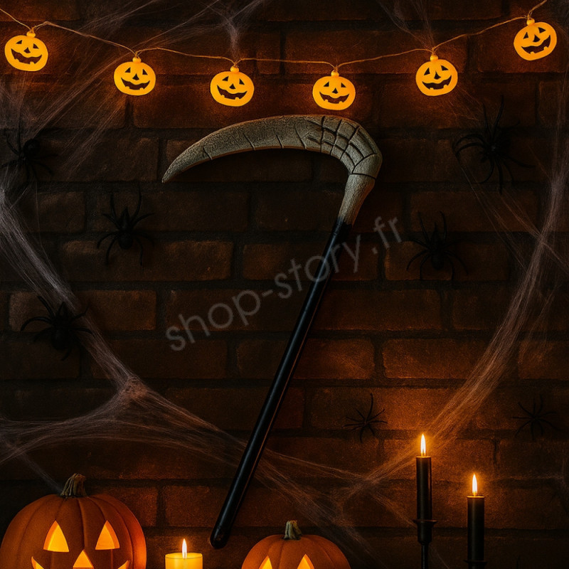 Fabriquée en plastique robuste mais léger, cette grande faux est conçue pour résister aux manipulations répétées tout en assurant une prise en main confortable et sécurisée. Aucun tranchant réel : elle est adaptée à une utilisation festive, en intérieur comme en extérieur (par temps sec).