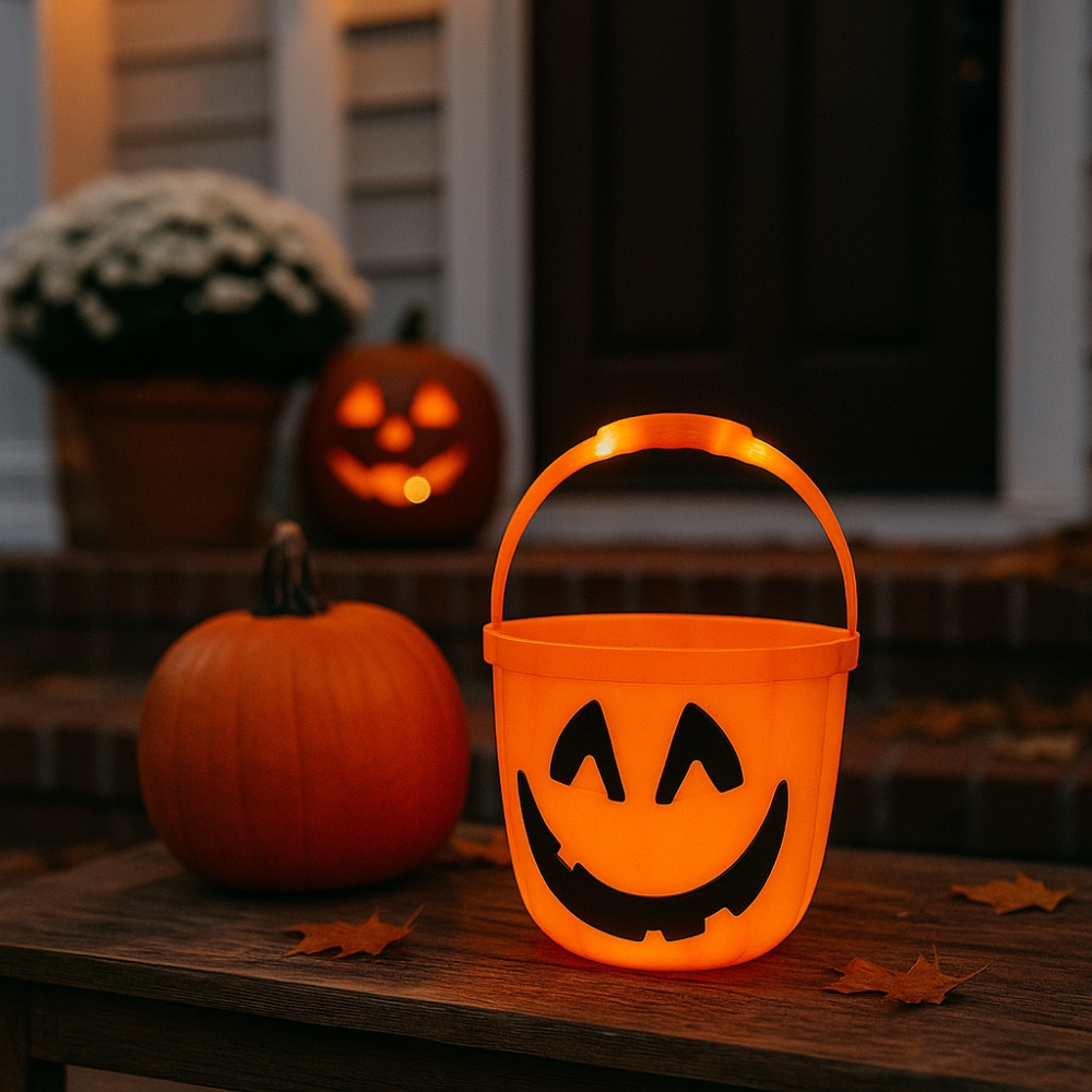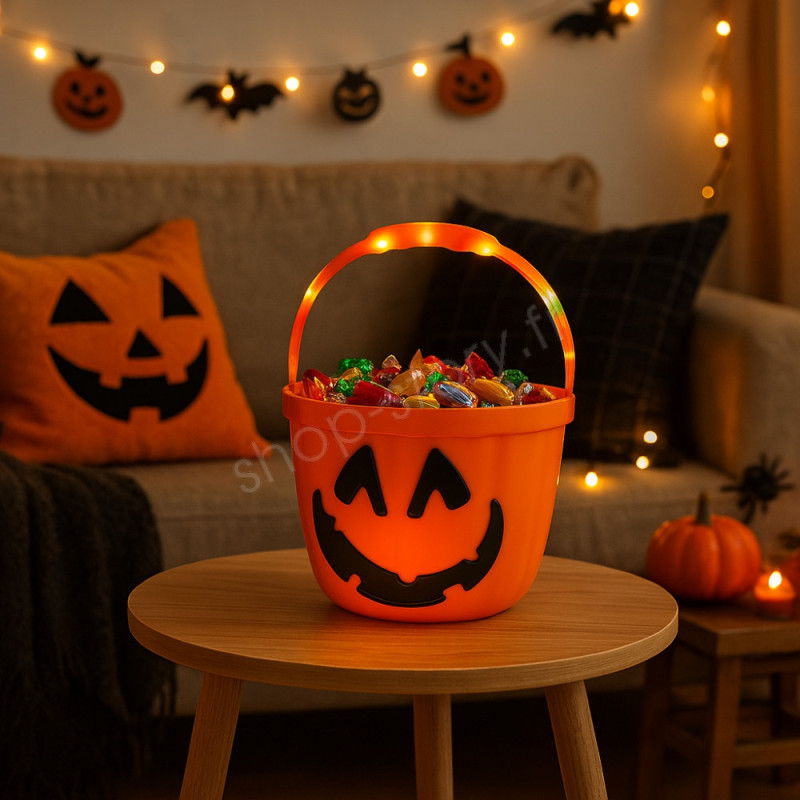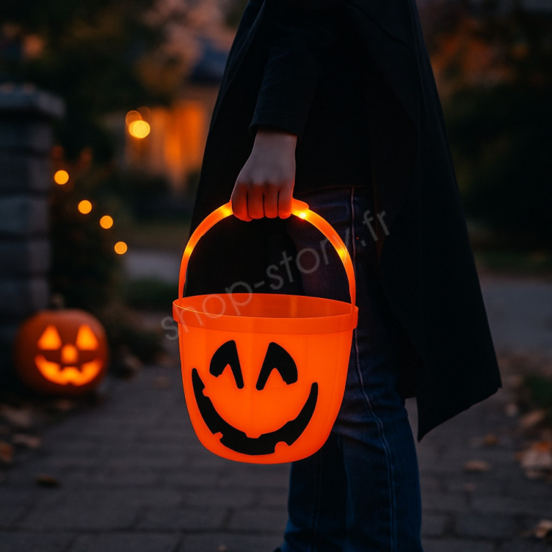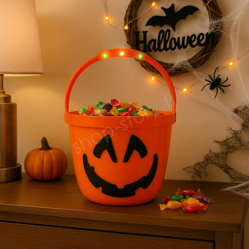 Avec sa teinte orange vive et son apparence typiquement halloweenesque, ce seau attire tous les regards. Il s’accorde parfaitement avec les déguisements, les décorations effrayantes et les thèmes automnaux, contribuant à créer une ambiance authentique et conviviale.