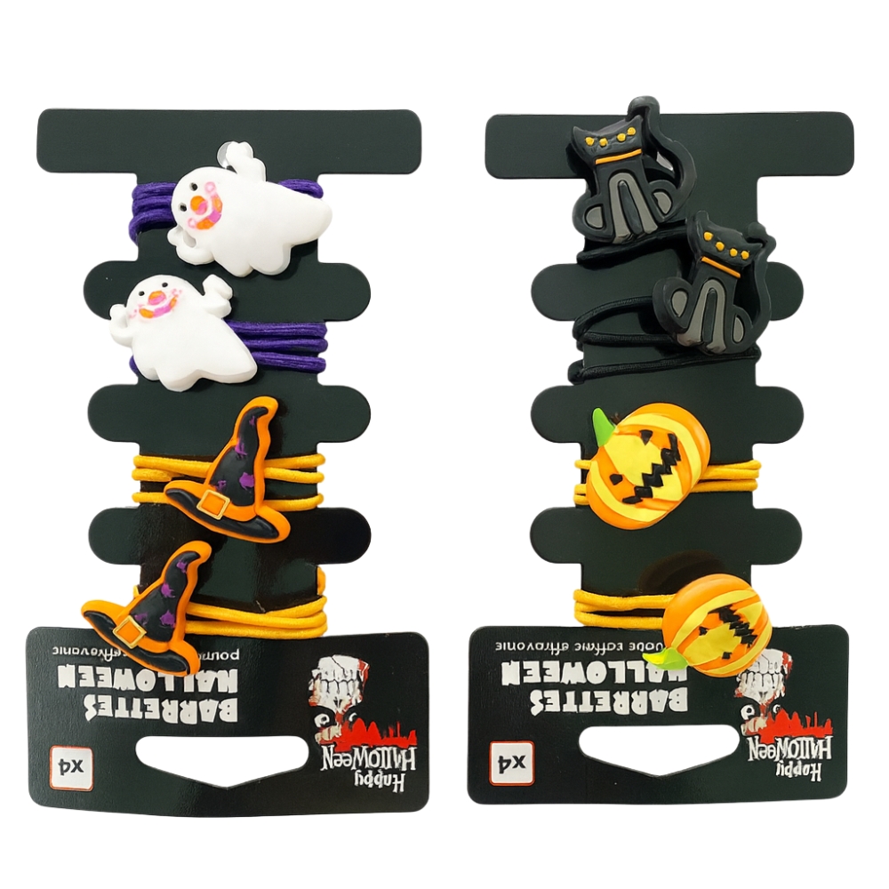 Ajoutez une touche festive à vos coiffures avec ce lot de 8 élastiques à cheveux Halloween décorés de citrouilles, chats noirs, fantômes et chapeaux de sorcières. Les élastiques en textile doux assurent une excellente tenue, tandis que les personnages en silicone souple apportent un effet décoratif original. Parfaits pour enfants et adultes, ils sont idéals pour les soirées déguisées, fêtes scolaires ou pour compléter une tenue à thème.