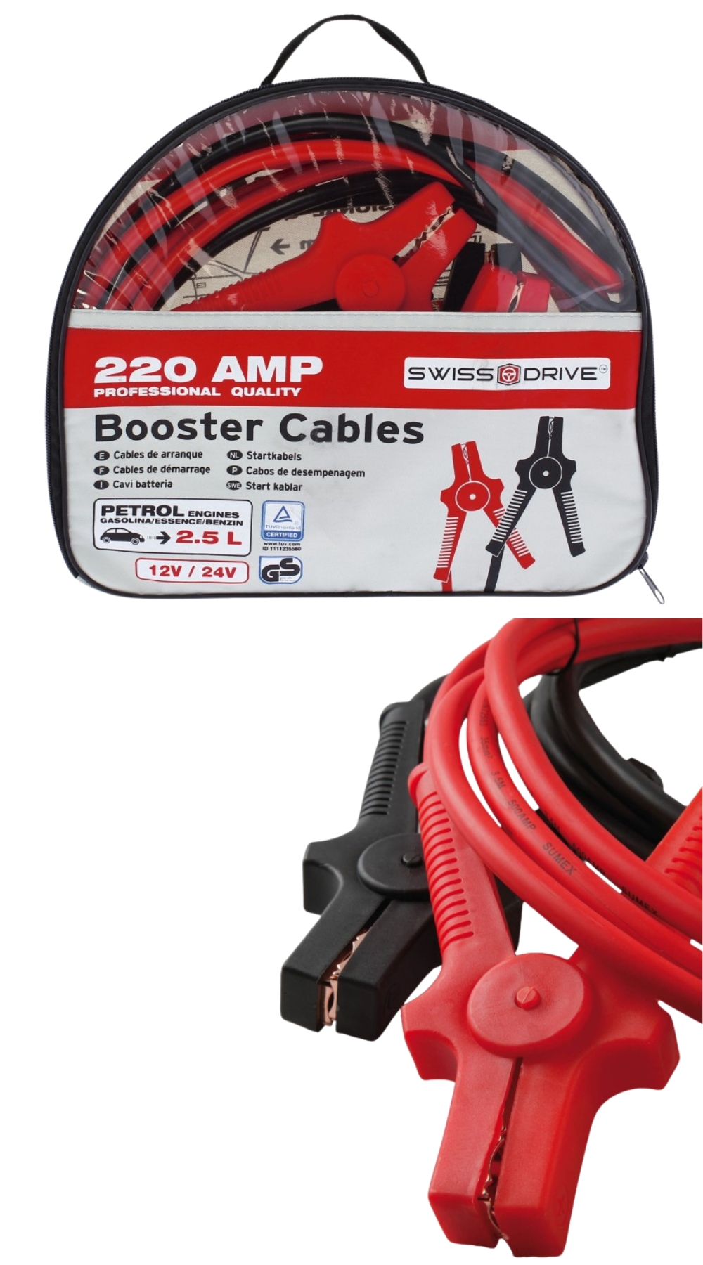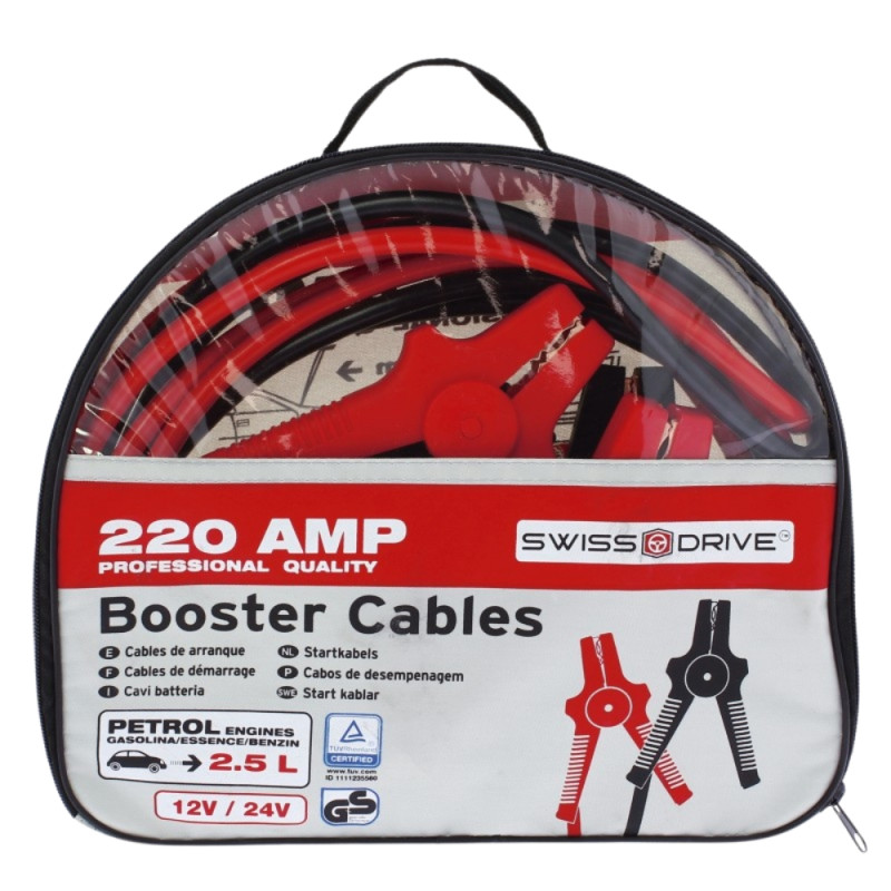 Conçus pour offrir une performance fiable et une utilisation maîtrisée, les câbles de démarrage SWISS DRIVE 220A associent des spécifications techniques précises à une conception robuste, parfaitement adaptée aux véhicules essence jusqu’à 2.5L.