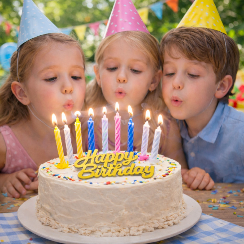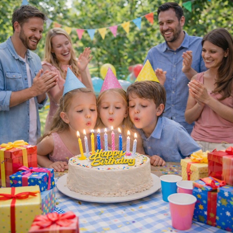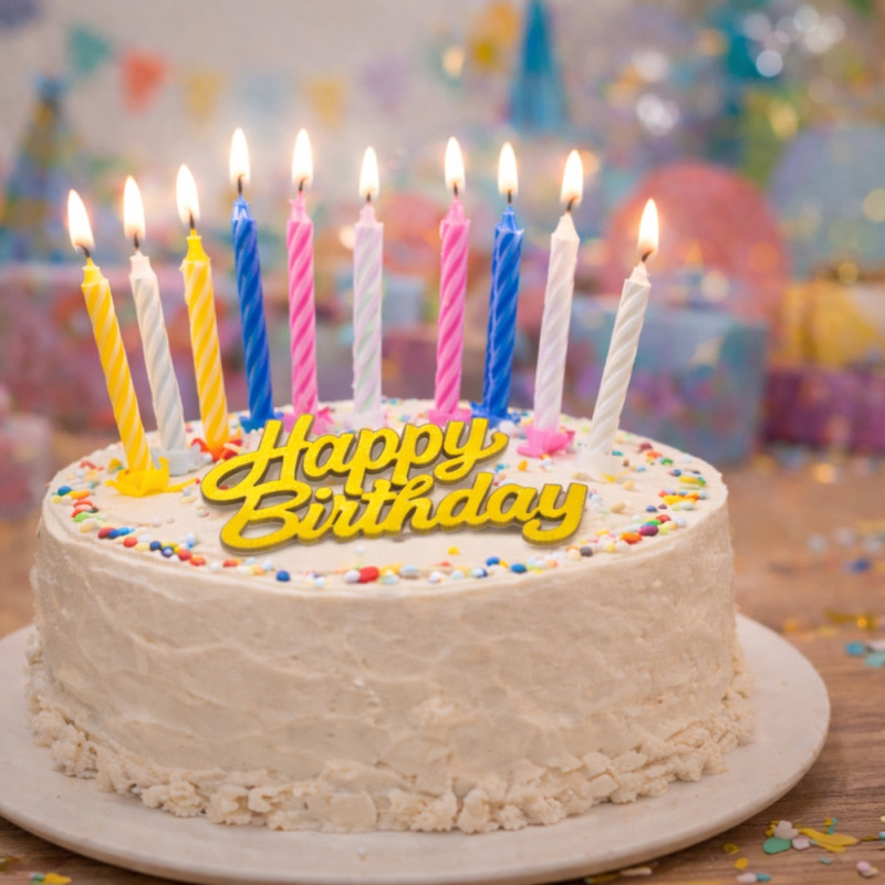 Le topper doré “Happy Birthday” apporte une touche chic et moderne, tandis que les bougies multicolores ajoutent une ambiance joyeuse et lumineuse.