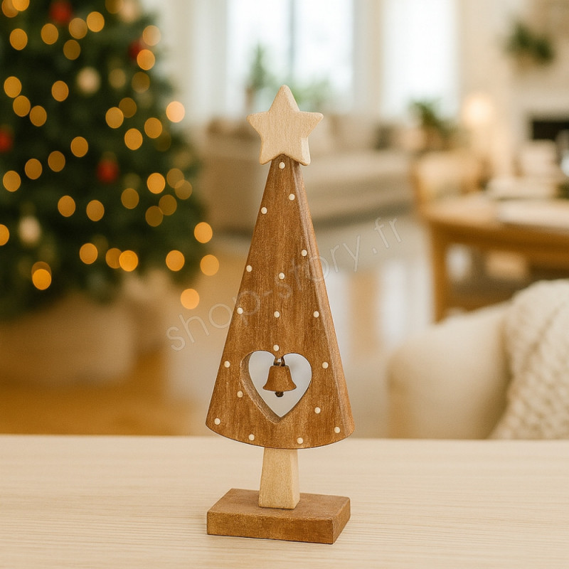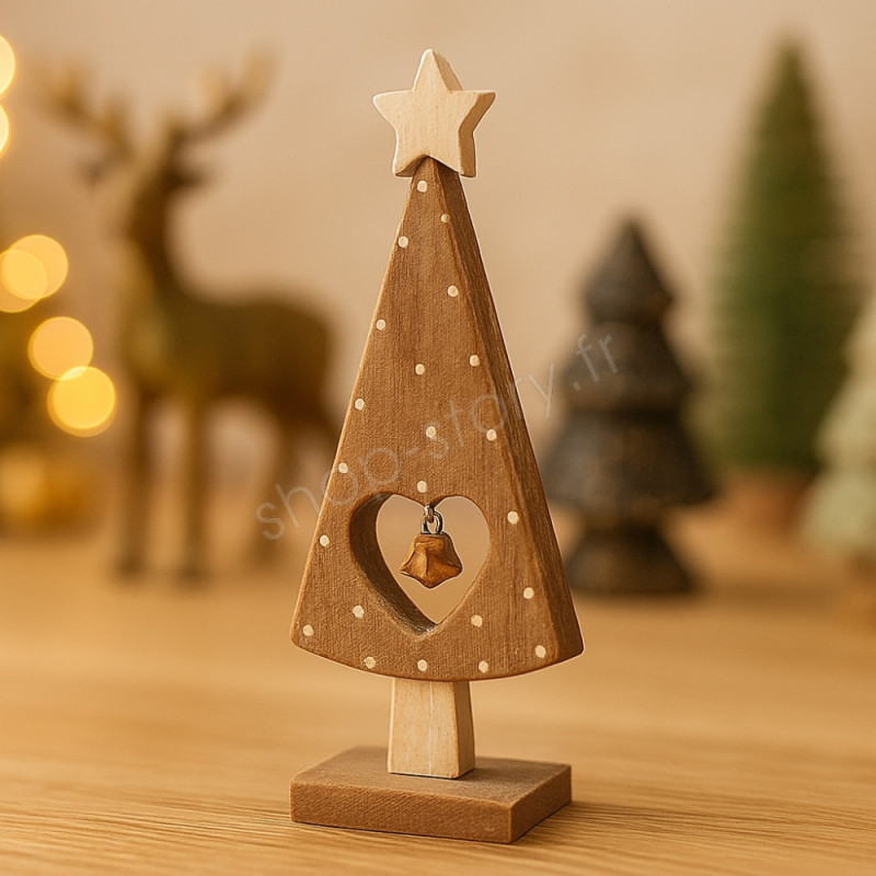 Ce sapin décoratif en bois se distingue par son charme authentique et son style artisanal. Sa silhouette élancée, ornée d’une étoile en bois au sommet, est mise en valeur par une finition rustique et chaleureuse qui rappelle les décorations traditionnelles de Noël. Au centre, une découpe en forme de cœur abrite une délicate clochette suspendue, ajoutant une note festive et poétique à l’ensemble. De petits points décoratifs viennent subtilement rythmer sa surface, renforçant son aspect fait main et son esthétique chaleureuse.