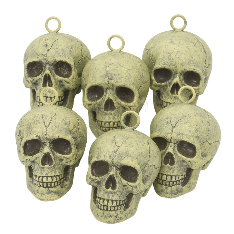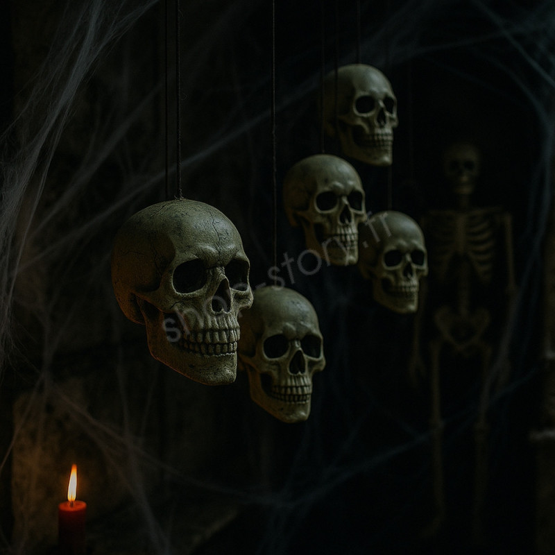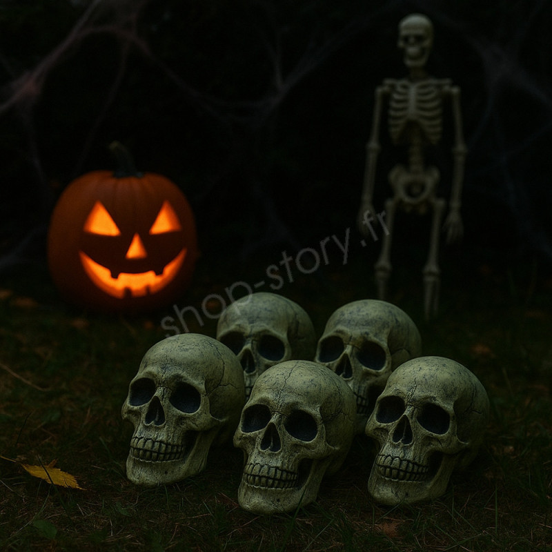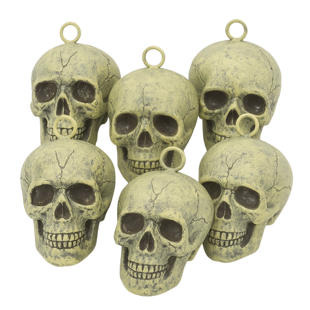 Ce lot de 6 têtes de mort décoratives est conçu pour tous ceux qui veulent transformer leur intérieur en véritable scène d’horreur le soir d’Halloween. Fabriquées en plastique léger mais robuste, ces têtes mesurent environ 10 cm chacune et sont livrées dans un filet pratique pour un rangement et un transport faciles. Leur teinte beige verdâtre, associée à un effet patiné et à des détails sculptés réalistes, crée une illusion saisissante, parfaite pour impressionner vos convives.