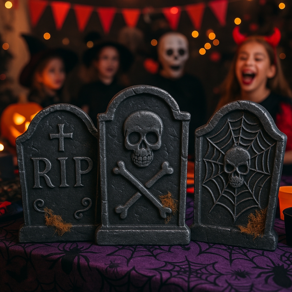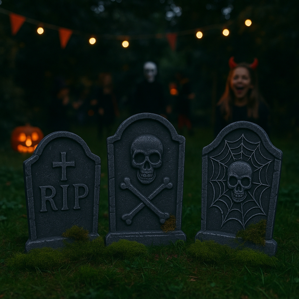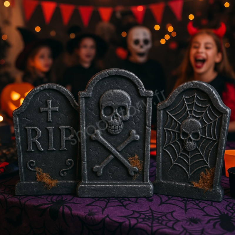 Les motifs varient (inscription “RIP”, crâne et os croisés, toile d’araignée) pour un rendu plus vivant et crédible, créant ainsi un décor cimetière réaliste qui séduira les petits comme les grands. Les effets de texture et de mousse décorative ajoutent une dimension authentique et vieillie, idéale pour renforcer l’ambiance hantée recherchée.