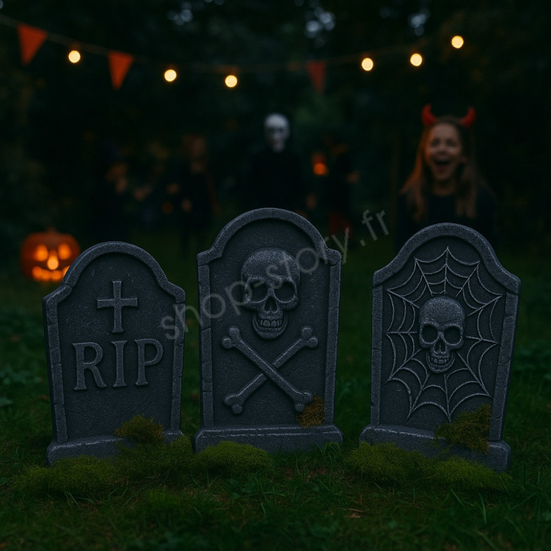 Polyvalentes, ces pierres tombales peuvent être utilisées aussi bien en extérieur (dans une pelouse, près d’un chemin ou le long d’un portail) qu’en intérieur, pour créer une scénographie immersive lors d’une soirée costumée. Grâce à leur légèreté, elles peuvent être fixées, posées ou même suspendues facilement selon vos besoins décoratifs.