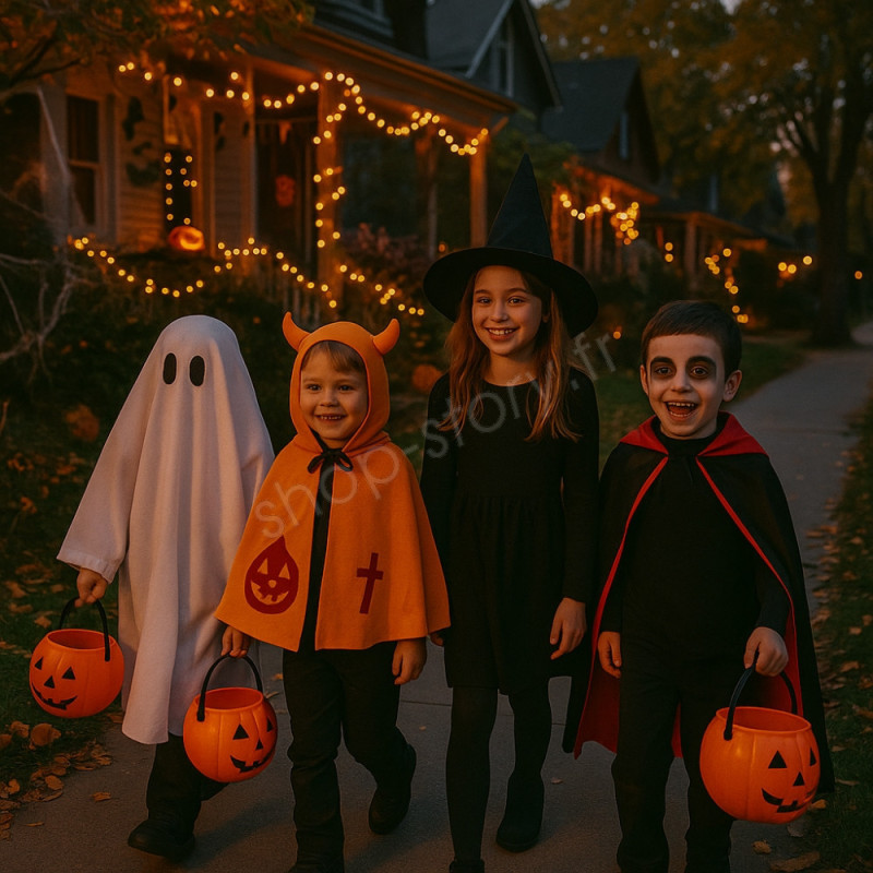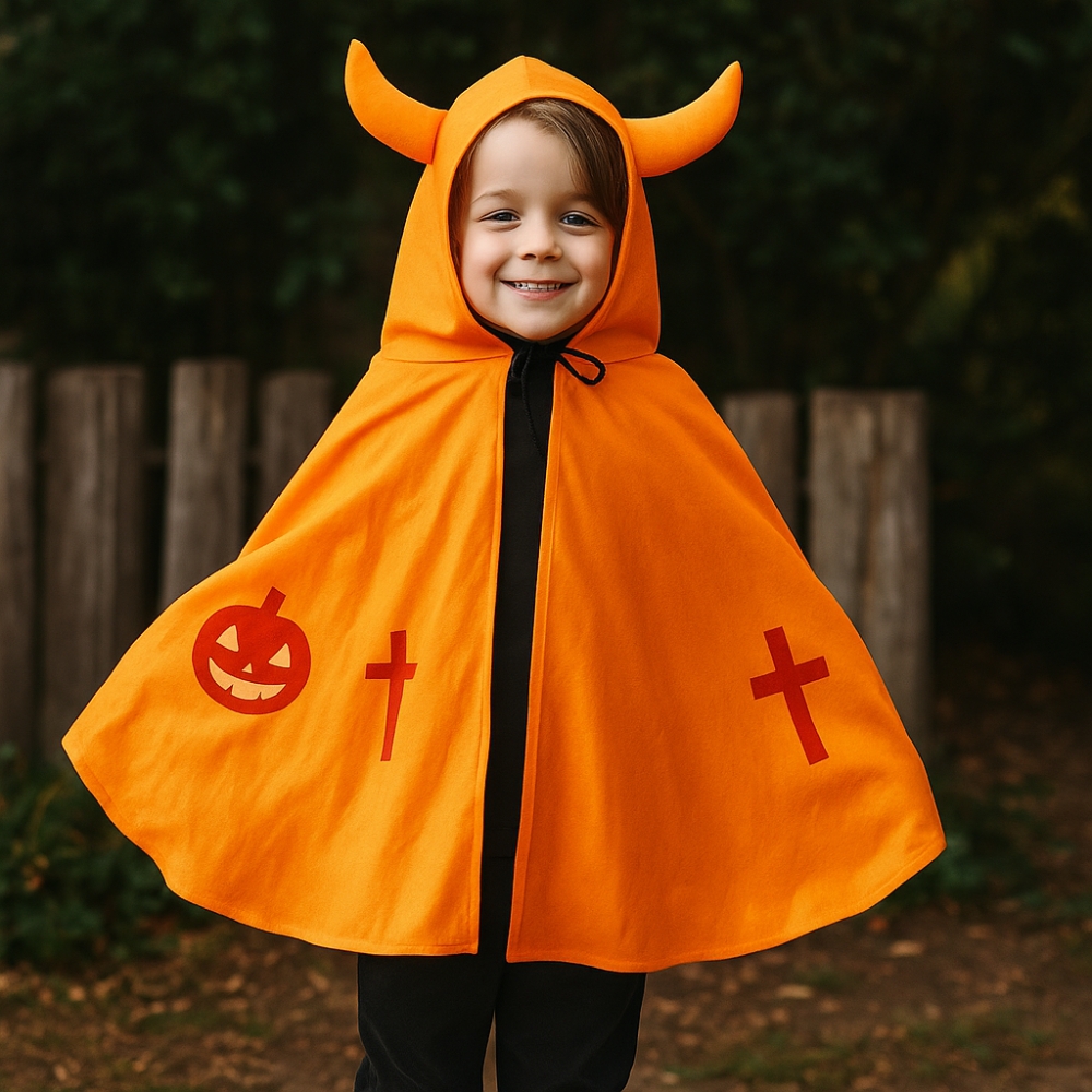 Son orange lumineux attire l’œil et rappelle immédiatement les couleurs emblématiques d’Halloween. La capuche à cornes souples ajoute une touche espiègle et amusante, sans gêner le confort. Les motifs imprimés citrouille et croix sont résistants, même après plusieurs lavages, pour pouvoir réutiliser la cape d’une année sur l’autre.