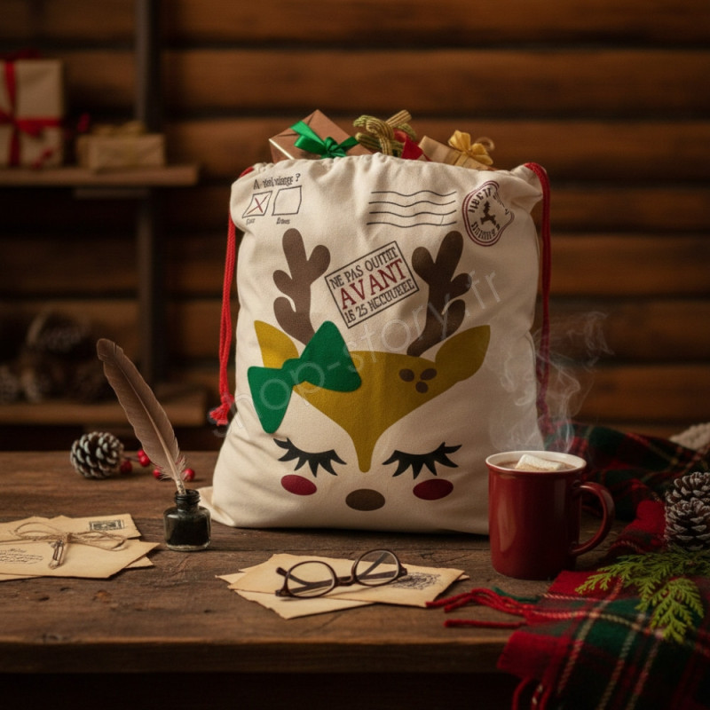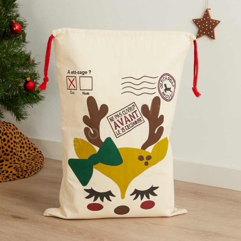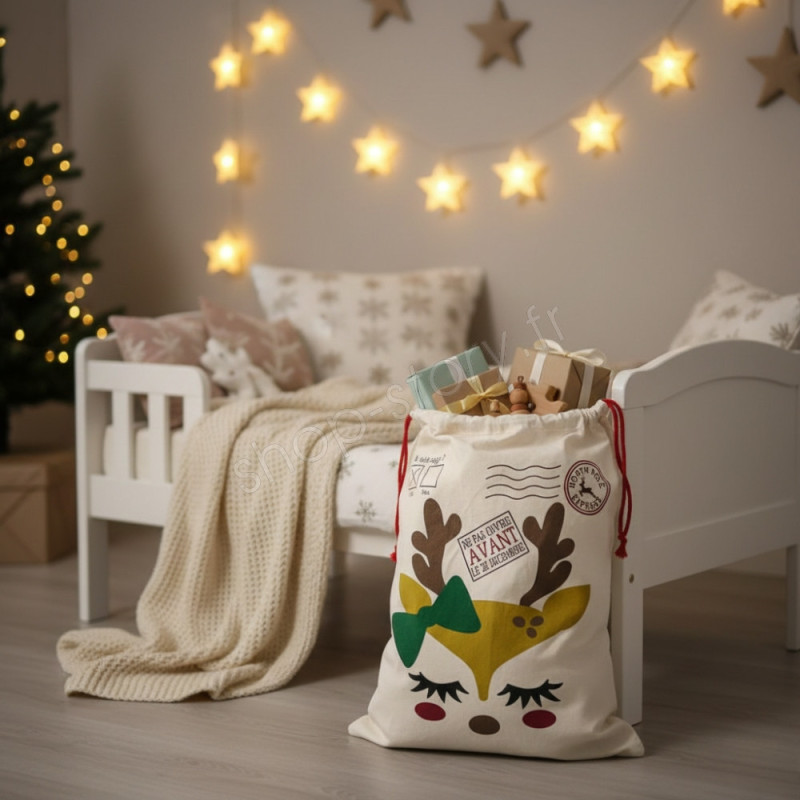 Cette hotte de Noël format M (70 × 50 cm) est pensée pour apporter une touche féerique à vos fêtes de fin d’année. Confectionnée dans une toile épaisse 100 % coton, elle garantit une résistance optimale et une tenue parfaite, même lorsqu’elle est remplie de cadeaux volumineux. Son motif petit renne, avec son nœud vert, ses bois délicatement dessinés et ses joues rosées, apporte un charme unique qui émerveille petits et grands. On retrouve également des éléments graphiques inspirés du courrier du Père Noël, comme les mentions « A été sage ? » et « Ne pas ouvrir avant le 25 décembre », qui renforcent le caractère ludique et authentique du produit.