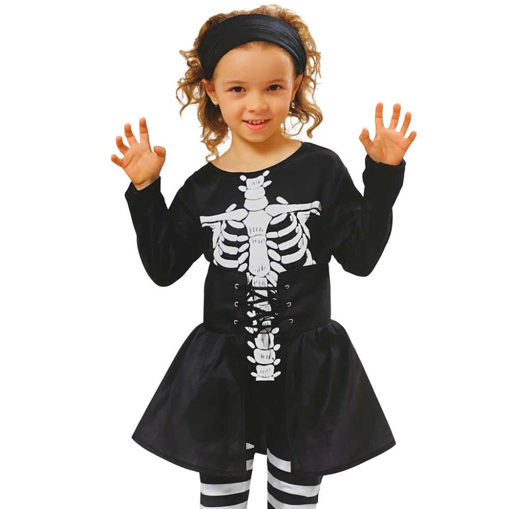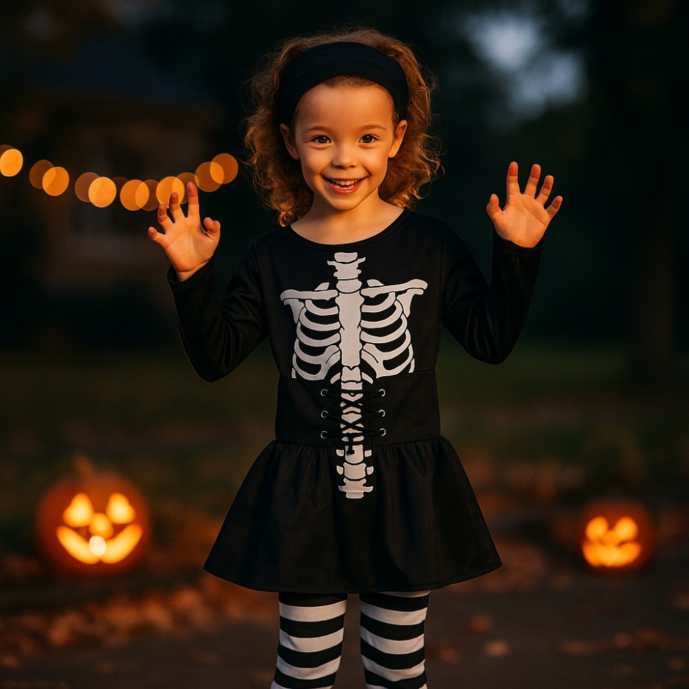 Ce déguisement Halloween pour fille inclut un t-shirt à manches longues, une jupe superposée fluide et un pantalon imprimé squelette, formant une tenue harmonieuse et visuellement marquante. Chaque pièce a été pensée pour s’associer parfaitement, permettant de créer en quelques secondes un look effrayant et élégant sans accessoires supplémentaires.