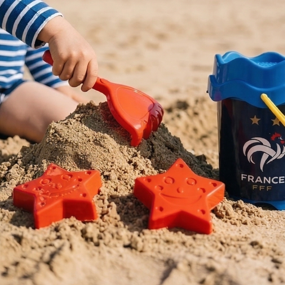 Nous avons acheté ce seau pour notre fils avant de partir à la mer et il ne le quitte plus ! Le kit est complet, solide et les accessoires sont faciles à manipuler pour les enfants. Il adore construire des châteaux de sable avec les moules étoiles et le design Équipe de France lui plaît énormément. Très bon rapport qualité-prix, je recommande sans hésiter pour les petits fans des Bleus !