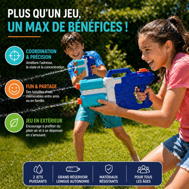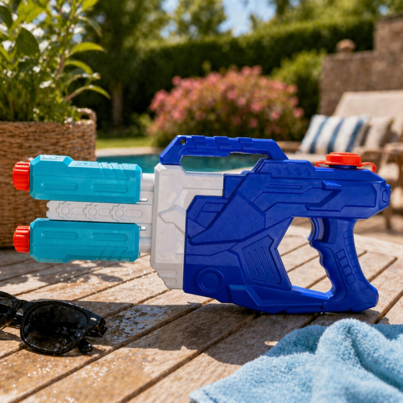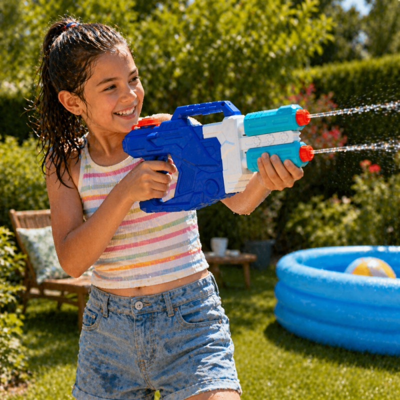 Grâce à son système innovant à double jets puissants, ce pistolet assure une portée longue distance, parfaite pour des batailles d’eau dynamiques et immersives. Que ce soit dans un jardin, au bord d’une piscine ou sur la plage, il permet d’atteindre facilement ses adversaires tout en s’amusant en toute sécurité.