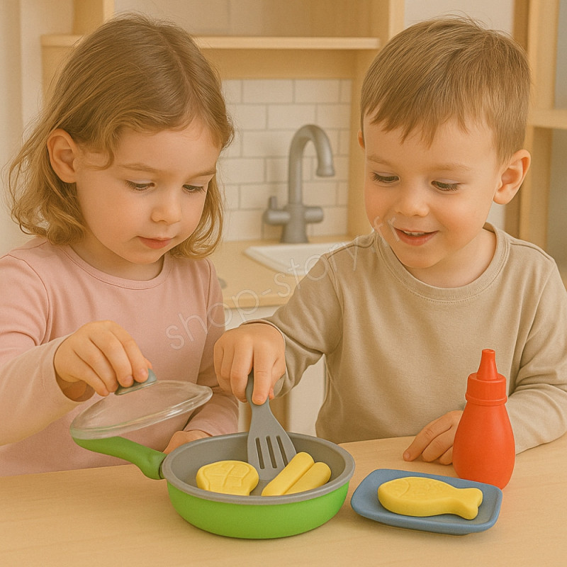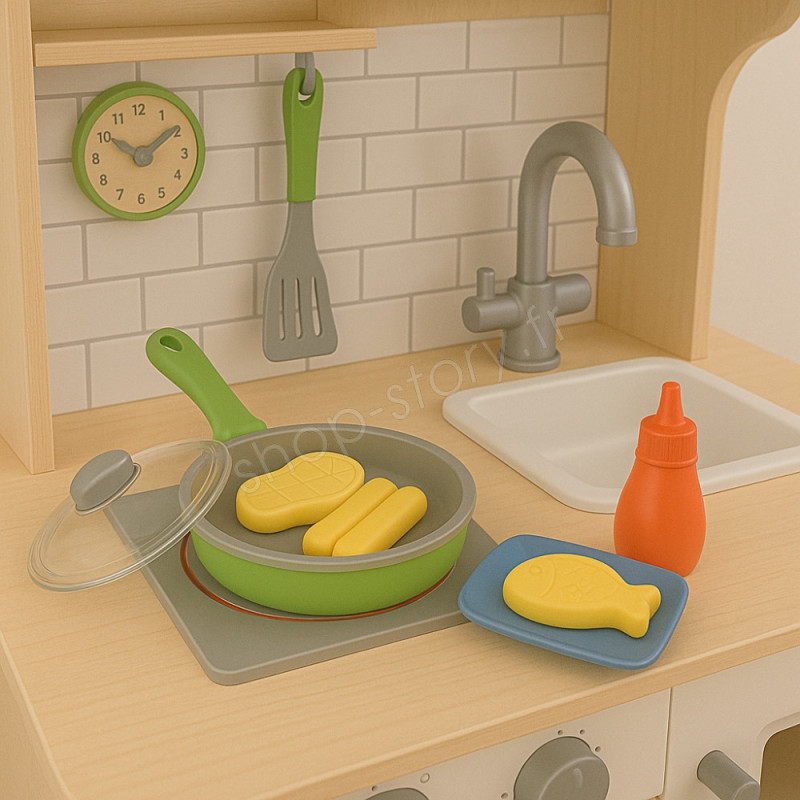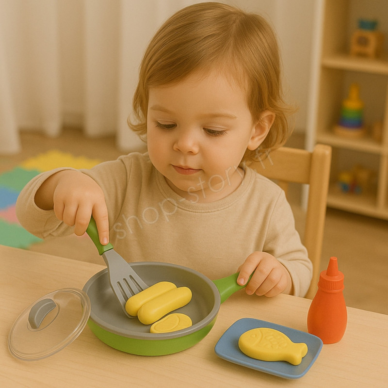 Mais la magie ne s’arrête pas là ! Les lumières colorées, synchronisées avec les sons, illuminent la scène de jeu et attirent naturellement le regard des tout-petits. Ce spectacle visuel stimule la perception et la coordination œil-main tout en prolongeant le plaisir du jeu. Enfin, les aliments magiques qui changent de couleur au contact de la poêle captivent les enfants et éveillent leur imagination. En observant cette transformation, ils apprennent à reconnaître les changements et à comprendre les phénomènes de cause à effet. Chaque utilisation devient une expérience d’éveil, de découverte et de créativité.