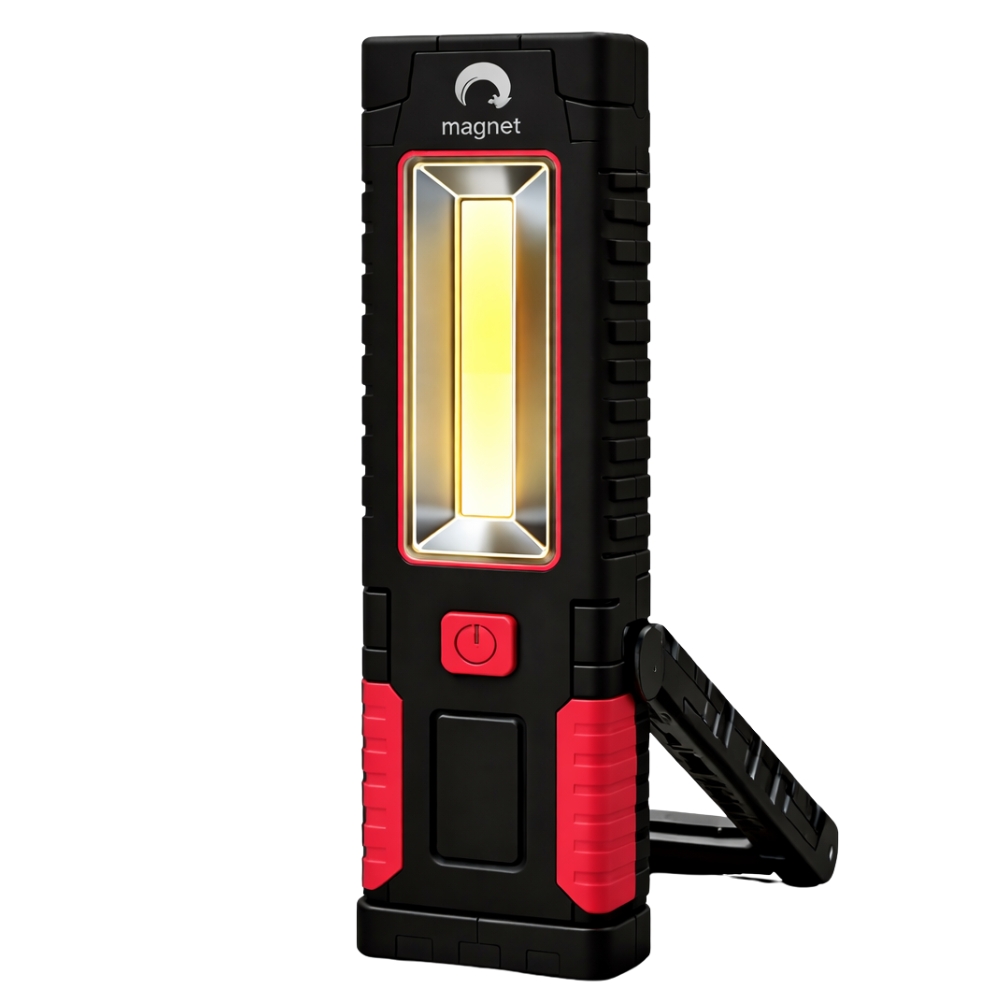 Le socle pliable permet de positionner la lampe dans différentes inclinaisons afin d’orienter la lumière exactement là où elle est nécessaire. Cette fonctionnalité est idéale pour travailler sur un établi ou une surface plane. L’utilisateur peut ajuster facilement l’angle d’éclairage pour éviter les ombres et améliorer la visibilité.