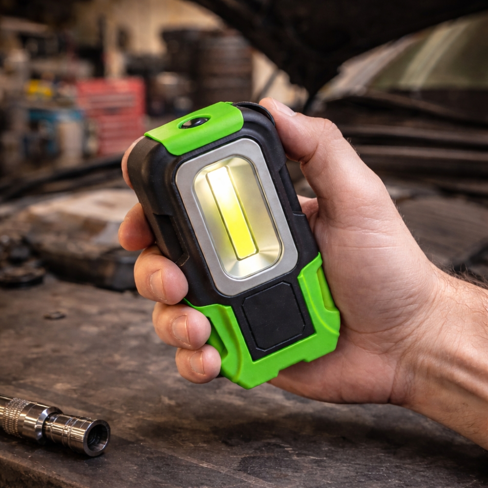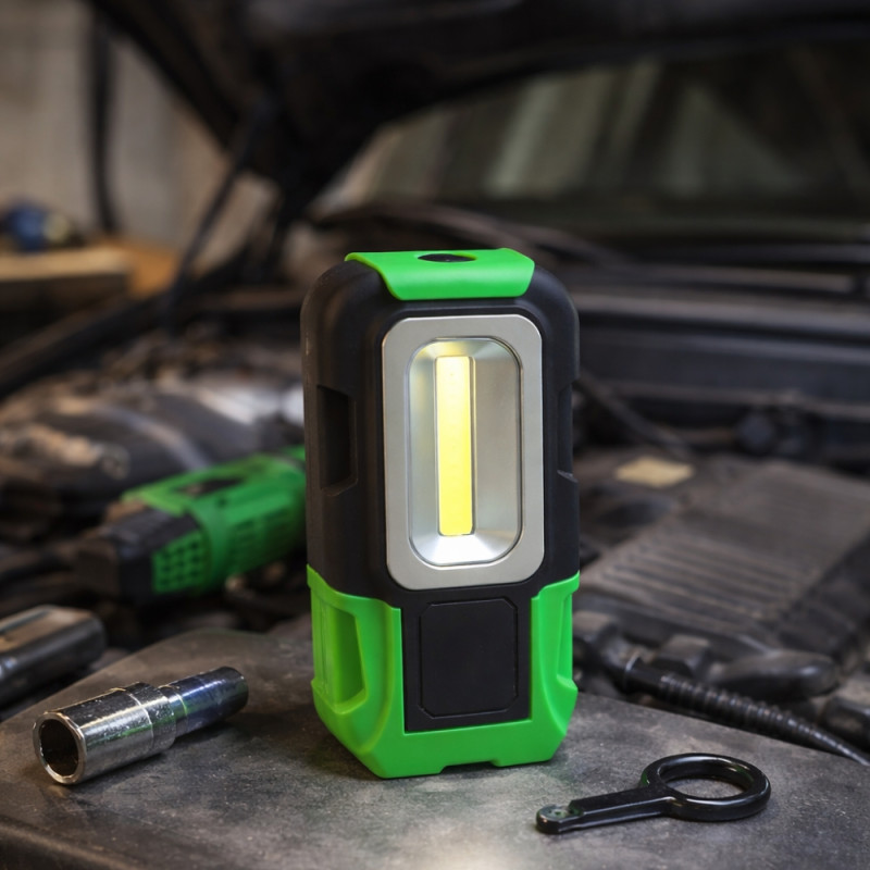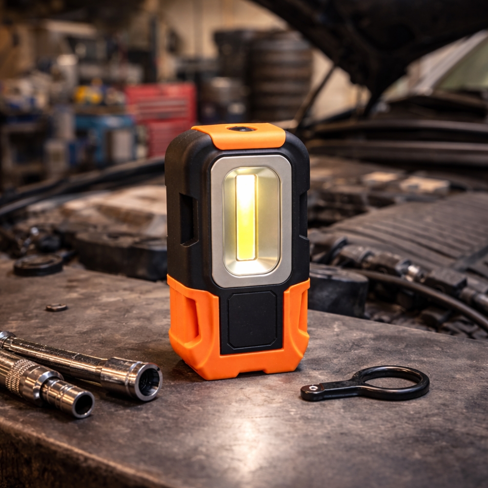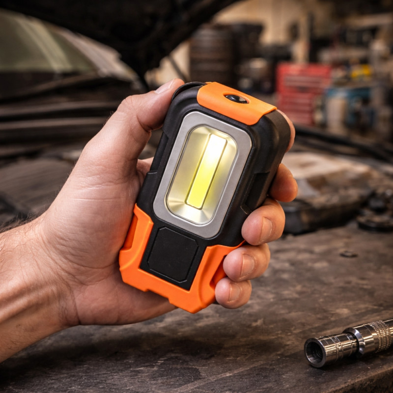 La base magnétique intégrée permet de fixer la lampe directement sur toute surface métallique. Cela libère complètement les mains pour effectuer des réparations ou manipuler des outils en toute sécurité. Le système magnétique est suffisamment puissant pour maintenir la lampe stable sur une carrosserie, un capot de voiture ou un établi métallique. Cette fonctionnalité transforme la lampe en véritable éclairage de travail mobile et adaptable. Elle devient particulièrement utile pour les mécaniciens, techniciens ou bricoleurs qui ont besoin d’un éclairage stable sans devoir tenir une lampe à la main.