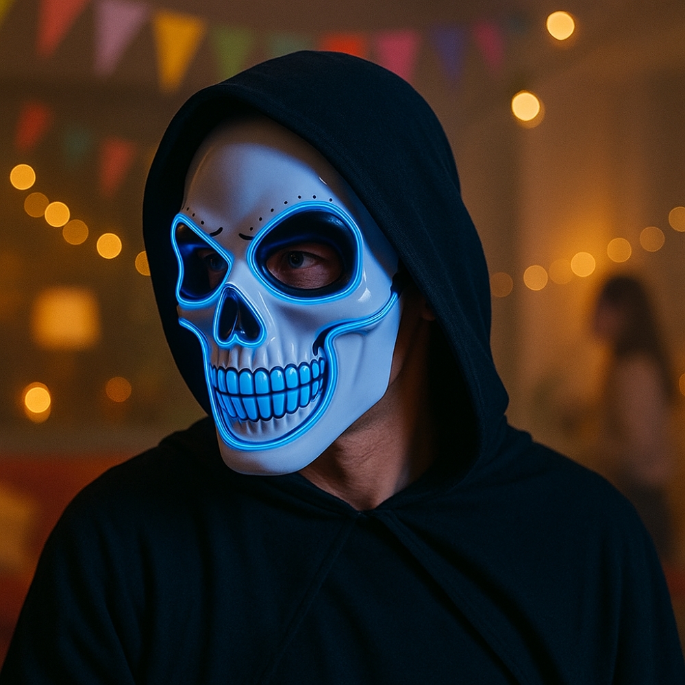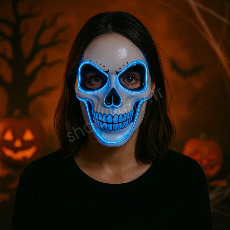 reliefs de crâne bien marqués sur une base blanche qui capte et renvoie la lumière bleue pour un rendu spectaculaire dans l’obscurité. Effet “tête de mort” net en photo/vidéo — idéal pour stories, reels et soirées à thème.