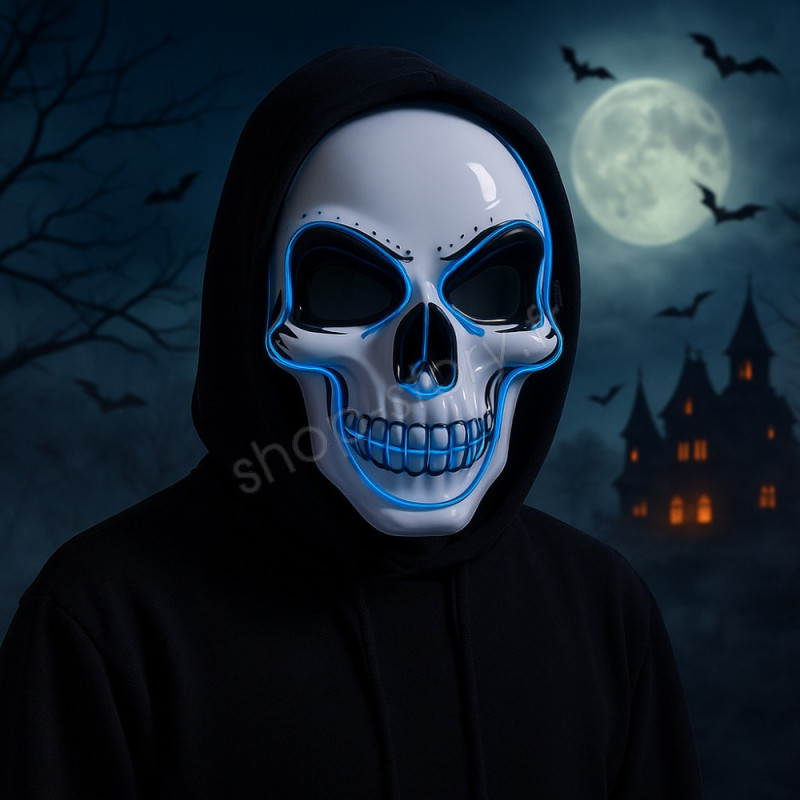 Masque crâne squelette blanc équipé d'un fil lumineux bleu pour un effet néon effrayant. Avec ses 2 modes d’éclairage (fixe ou clignotant), il est léger, confortable et parfait pour Halloween, soirées déguisées et cosplay.
