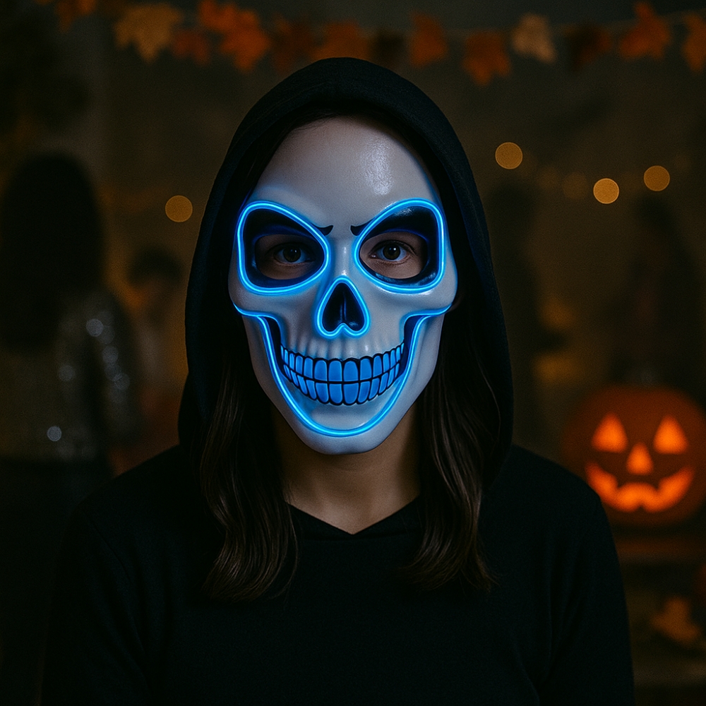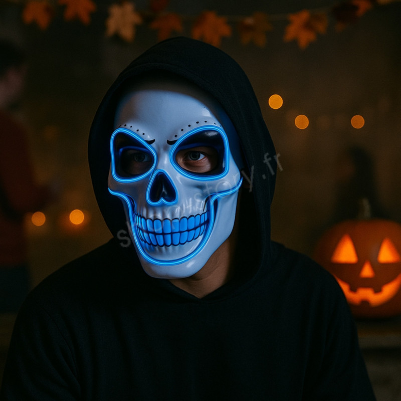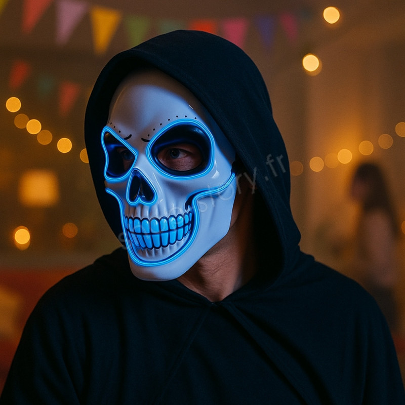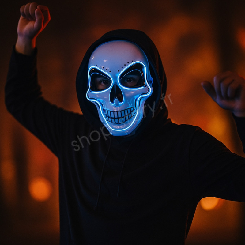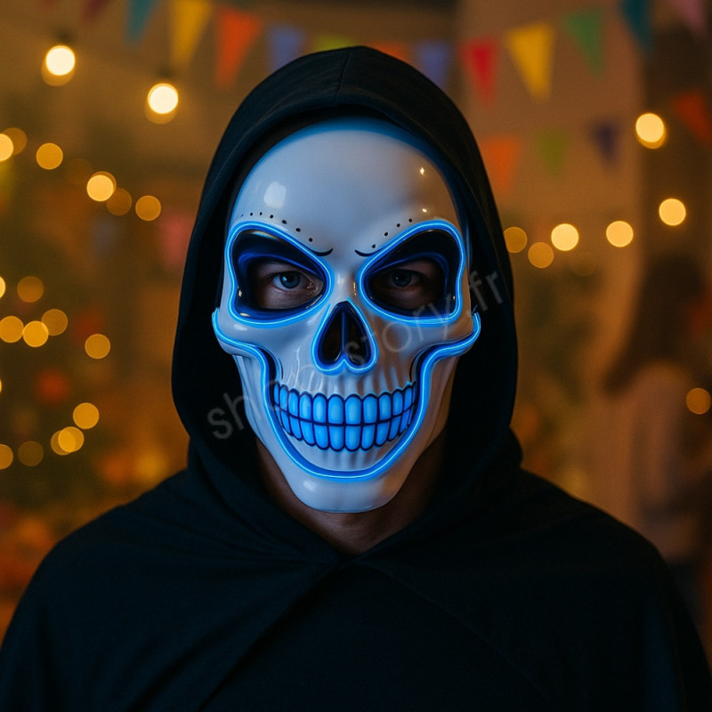 J’ai acheté ce masque pour une soirée Halloween et je n’ai pas été déçue ! Le fil lumineux bleu rend super bien dans le noir, tout le monde m’a complimentée sur mon déguisement. Il est léger, confortable et tient bien en place. Je recommande à 100 % pour un effet garanti !
