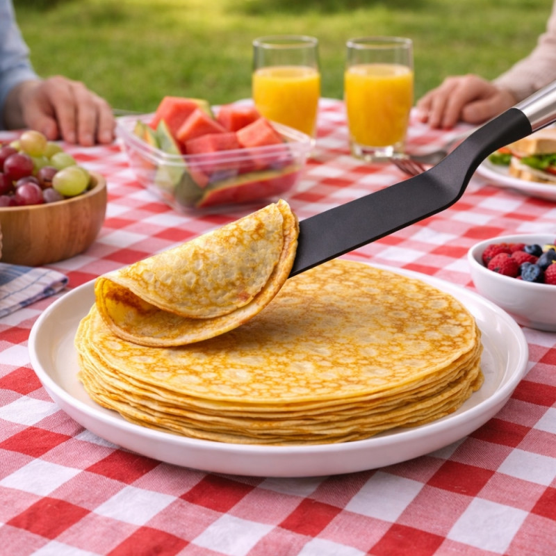 La conception coudée permet de glisser la spatule sous les crêpes sans effort, garantissant un retournement net et sans déchirure.