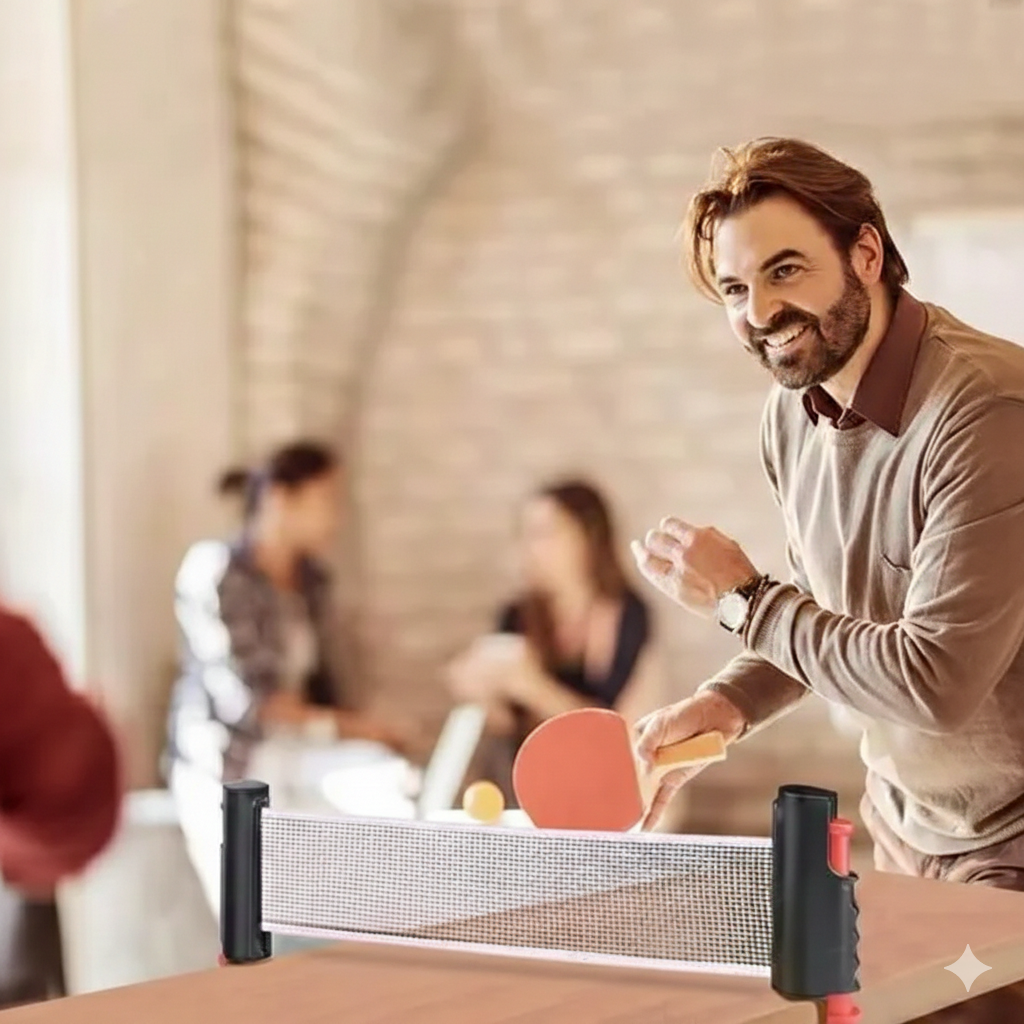Ce filet rétractable permet de convertir instantanément une table classique en véritable surface de jeu. Table de salle à manger, bureau, table de jardin ou table de camping deviennent en quelques secondes un terrain de ping-pong. Plus besoin d’équipement encombrant ni de table dédiée : le jeu s’invite partout, à tout moment.